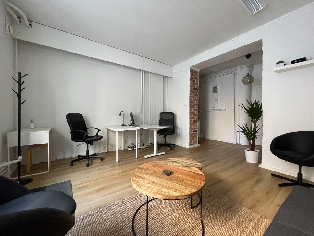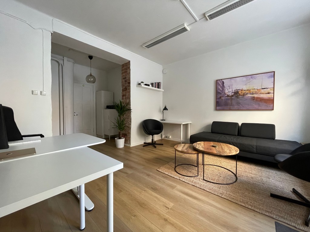 Liiketila jakautuu etu- ja takahuoneeseen, joissa on useita pöytäpaikkoja työskentelyä varten. Lisäksi tilan keskiosasta löytyy keittiö ja wc.